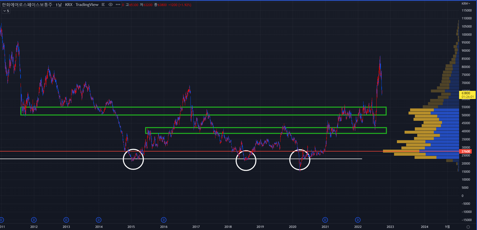 주봉차트를 통해 얻을 수 있는 중요한 단서는 한화에어로스페이스는 20000~ 23000원가격을 꾸준히 방어하고 있다는 사실입니다. 가격이 하락할 때 마다 이 지점에서는 하락이 멈추고 상승이 시작되었고 5년에 걸친 하락도 이 지점에서 높은 거래량이 발생하며 멈추게 되었고 이후 추가 상승하는 발판이 되었습니다. 공통점으로는 하락이 끝날 때 해당 레벨에서 높은 거래량이 동반되었다는 것입니다.