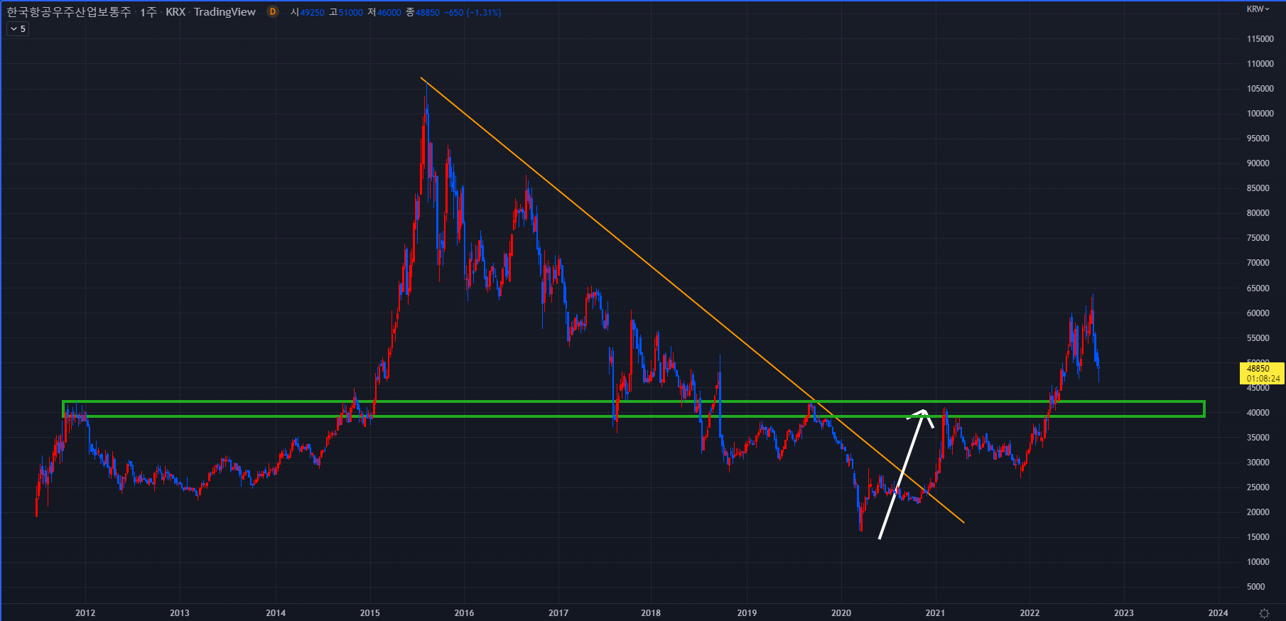그중 한국항공우주산업의 주가를 살펴보겠습니다. 2011년 상장이후 4년간 상승흐름에 들어가며 2015년에 급격한 상승으로 최고점을 기록했습니다. 하지만 뜨거웠던 관심과 상승은 한때로 끝나고 상승했던 만큼 하락하며 오히려 최저점을 갱신하였습니다. 2015년 고점에서 2020년 코로나 최저점까지 5년의 하락을 했습니다. 코로나 하락이후 회복 및 상승 단계에서 6년에 걸친 하락추세선을 위로 돌파하며 상승에 대한 암시 및 새로운 매수 바람이 불었고 약간의 조정 뒤에 다시 상승하여 남들은 하락한 2022년에 역주행하며 상승한 종목 중 하나입니다.