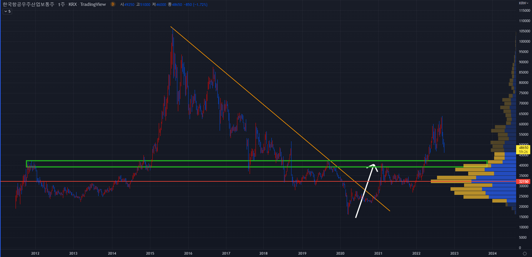 그중 한국항공우주산업의 주가를 살펴보겠습니다. 2011년 상장이후 4년간 상승흐름에 들어가며 2015년에 급격한 상승으로 최고점을 기록했습니다. 하지만 뜨거웠던 관심과 상승은 한때로 끝나고 상승했던 만큼 하락하며 오히려 최저점을 갱신하였습니다. 2015년 고점에서 2020년 코로나 최저점까지 5년의 하락을 했습니다. 코로나 하락이후 회복 및 상승 단계에서 6년에 걸친 하락추세선을 위로 돌파하며 상승에 대한 암시 및 새로운 매수 바람이 불었고 약간의 조정 뒤에 다시 상승하여 남들은 하락한 2022년에 역주행하며 상승한 종목 중 하나입니다.