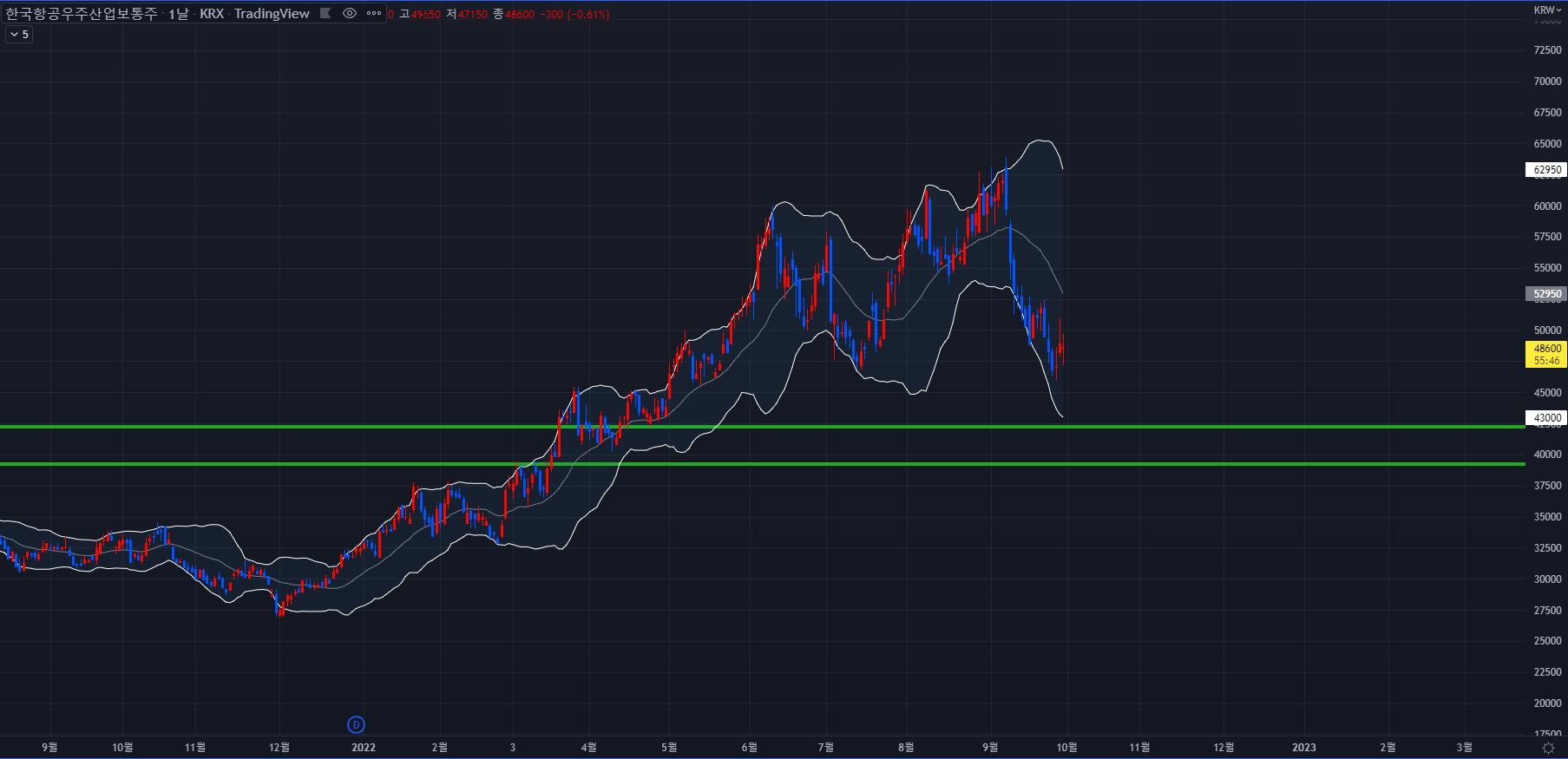 지난 3거래일의 흔적을보면 어찌어찌 양봉마감은 했지만 윗꼬리가 달리며 아직 매도세가 작용하는 모습입니다. 끝까지 이 매도세에 밀리지 않고 양봉을 유지할지 아니면 한차례 더 하락하여 주요 기준레벨인 40000 ~ 42000원까지 하락할지 살펴봐야합니다.