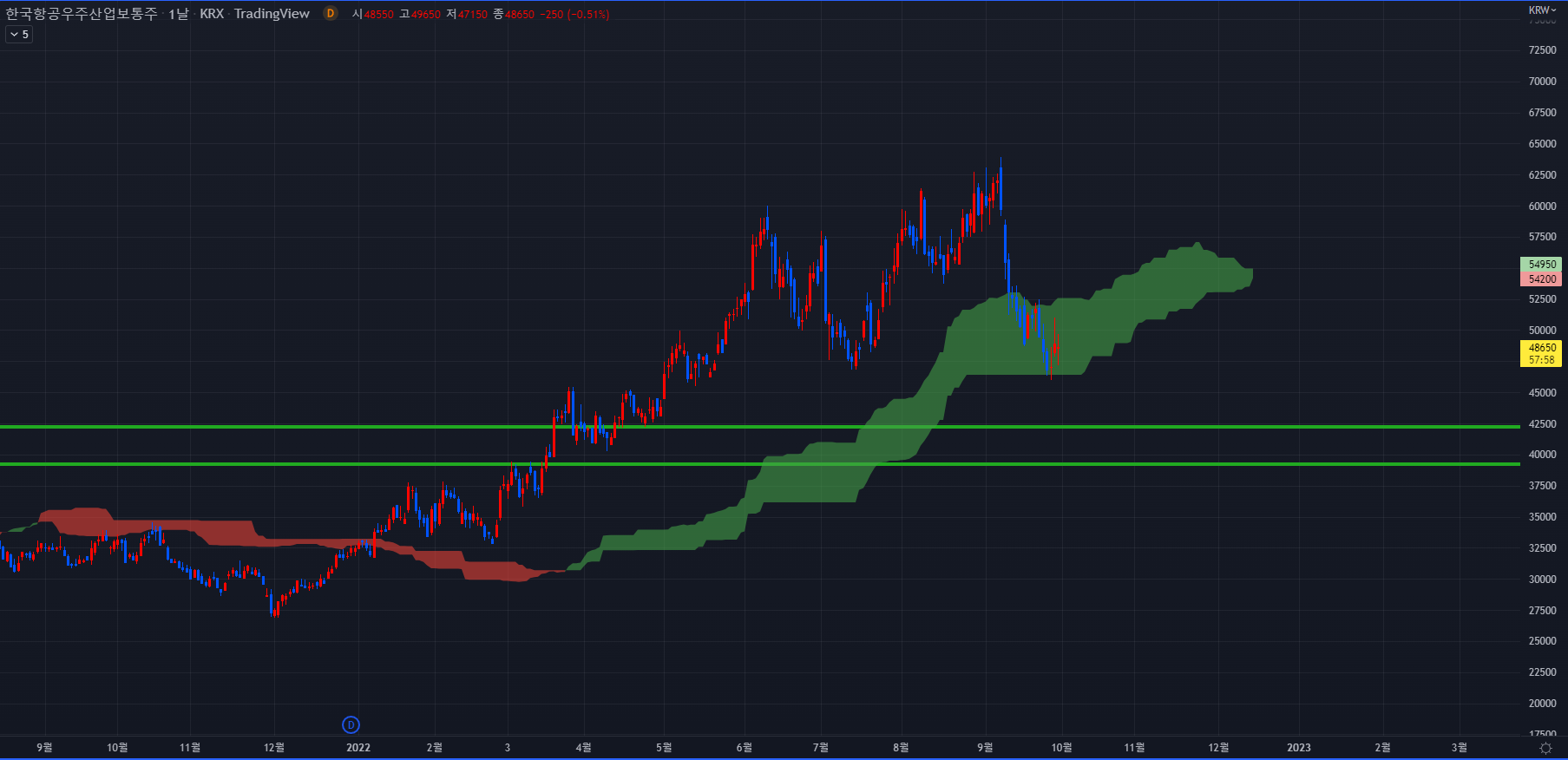 한국항공우주산업 2022년 9월 30일 일봉차트일봉의 일목균형표 상으로는 현재 구름떼 속에 있고 양운이기 때문에 지금 매수세가 등장해야하는 자리이지만