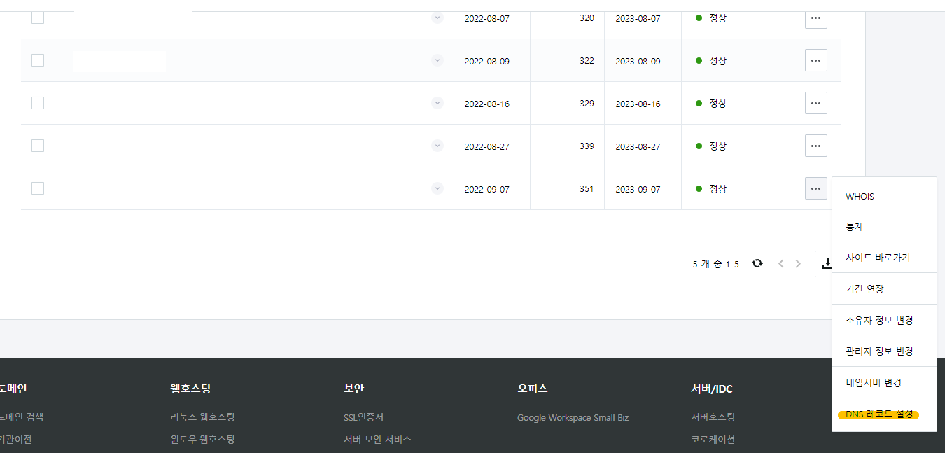 그럼 본인이 소유한 도메인들이 쭉 나오는데 거기서 하위도메인을 연결한 도메인에서 'DNS레코드 설정'으로 들어갑니다.