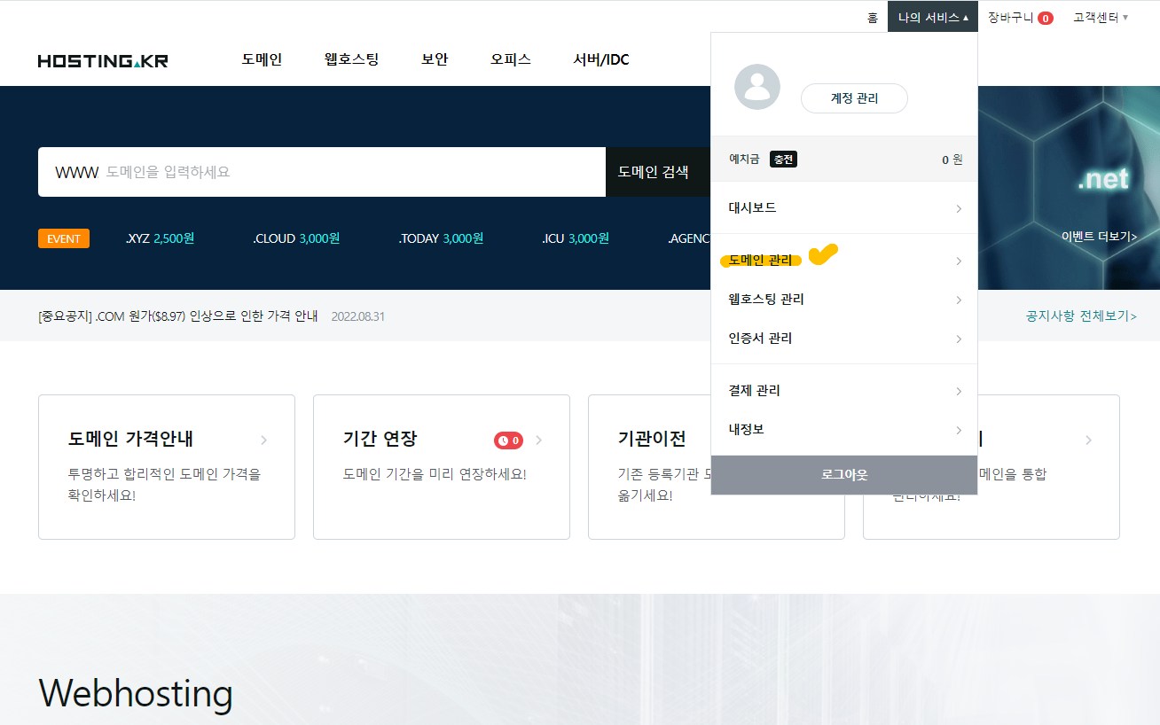 먼저, 본인이 2차도메인을 구매했던 호스팅사이트를 갑니다.