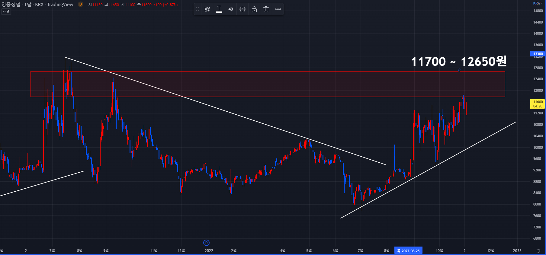 현재가는 11600원으로 최근 12000원을 터치하고 저항 받은 상태입니다. 12000원은 2021년 7월, 9월에도 주가에 영향을 주었던 저항레벨로 아주 중요한 기준입니다.