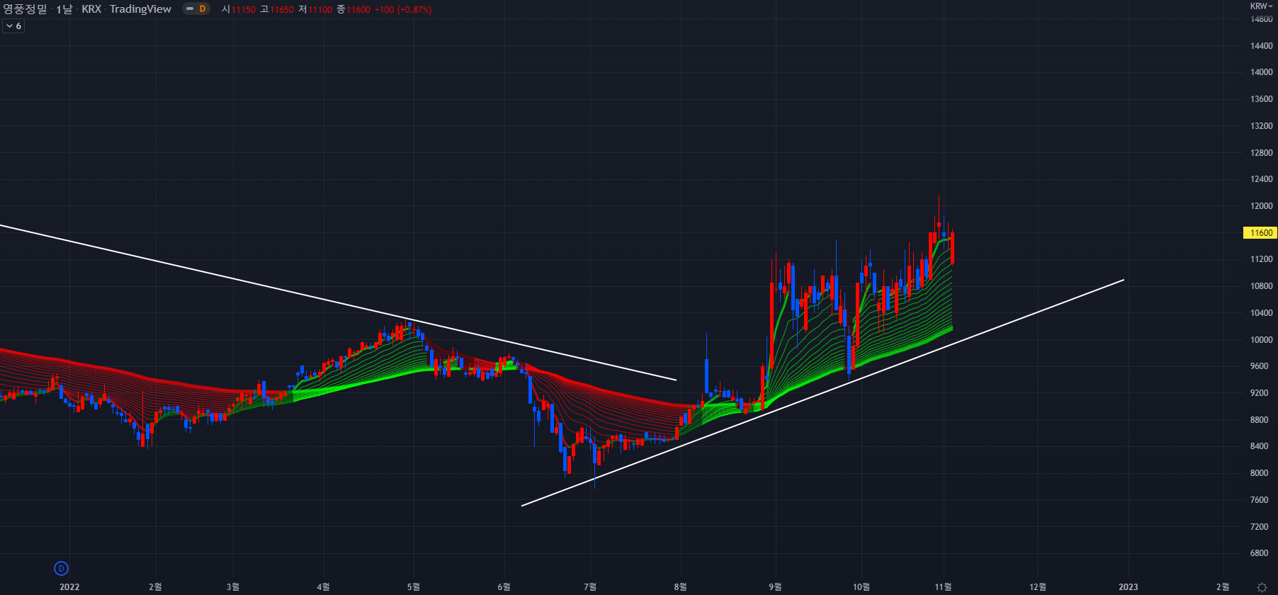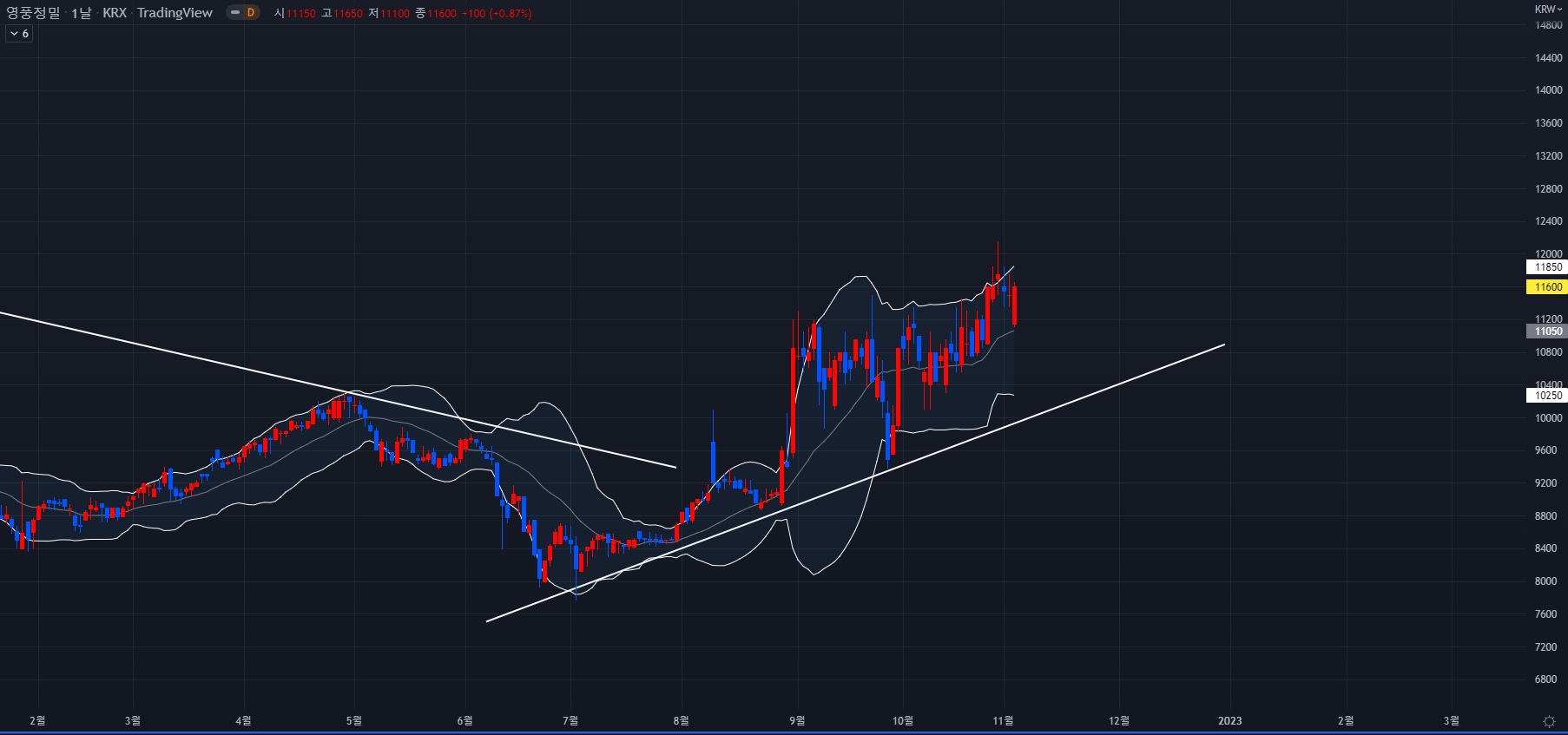2021년 7월 고점에서부터 하락하던 주가가 2022년 7월 저점을 기준으로 우상향하는 방향으로 바꾸고 있습니다.
