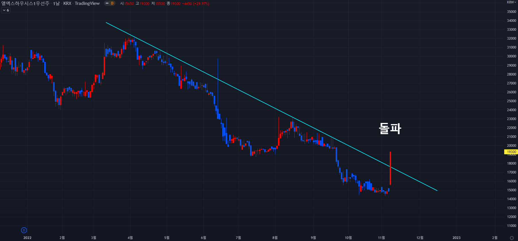 차트적으로 보았을 때 22년 3월에서부터 하락하던 흐름에서 오늘의 상한가 마감으로 하락 추세선을 위로 돌파하게 되었습니다.