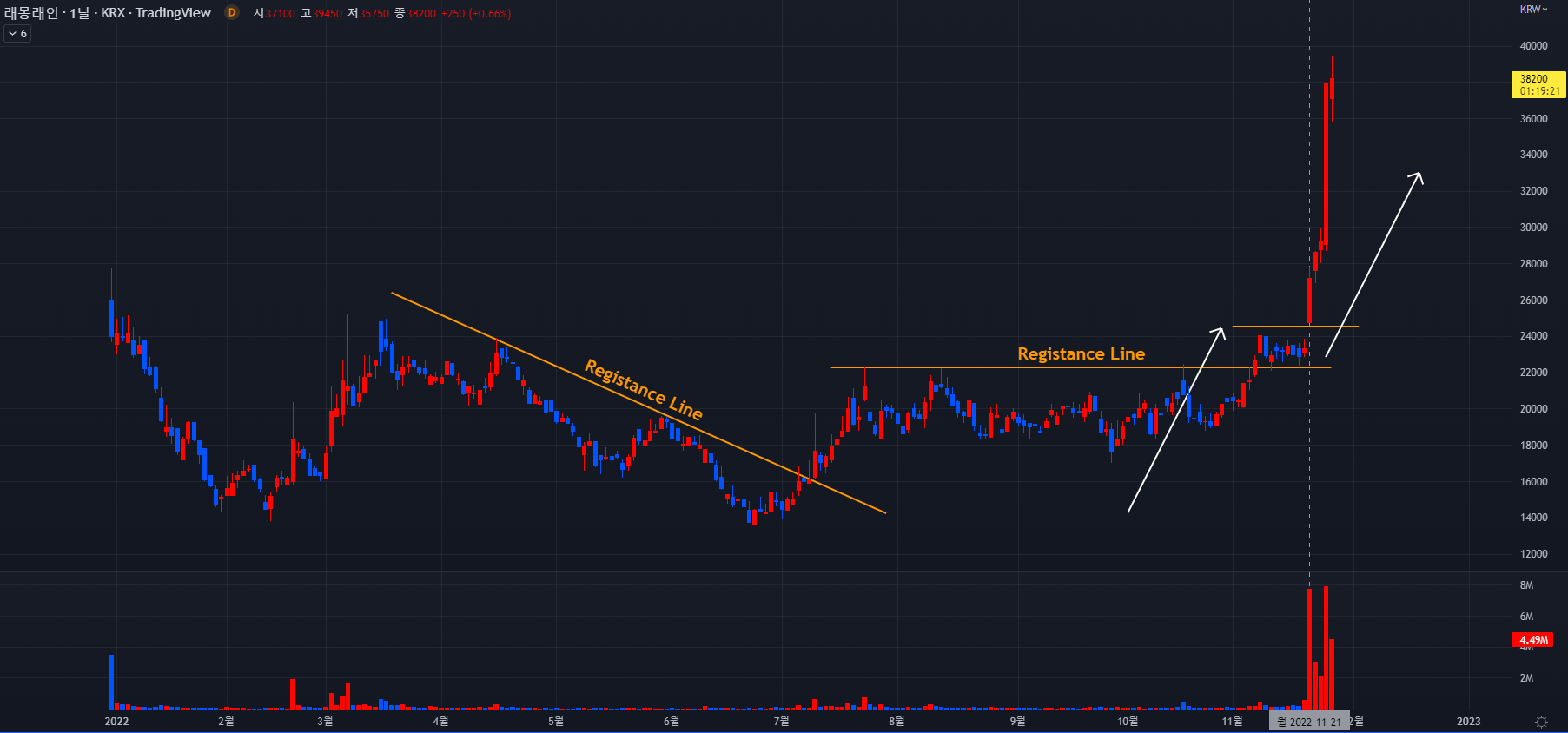 11월 21일 갭 상승을 시작으로 신고가를 갱신했고 이때 동반한 높은 거래량 또한 해동 종목에서 볼 수 없었던 이례적인 거래량입니다. 이후 높은 거래량을 유지하면서 더 큰 변동성을 불러 현재까지 상승 중에 있습니다.