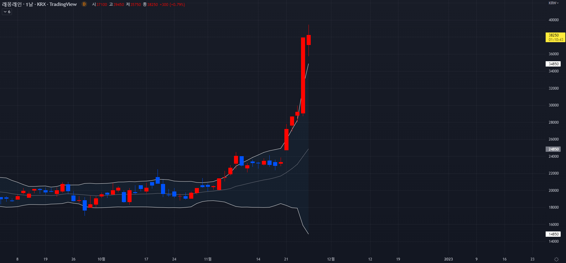 11월 21일 갭 상승을 시작으로 신고가를 갱신했고 이때 동반한 높은 거래량 또한 해동 종목에서 볼 수 없었던 이례적인 거래량입니다. 이후 높은 거래량을 유지하면서 더 큰 변동성을 불러 현재까지 상승 중에 있습니다.