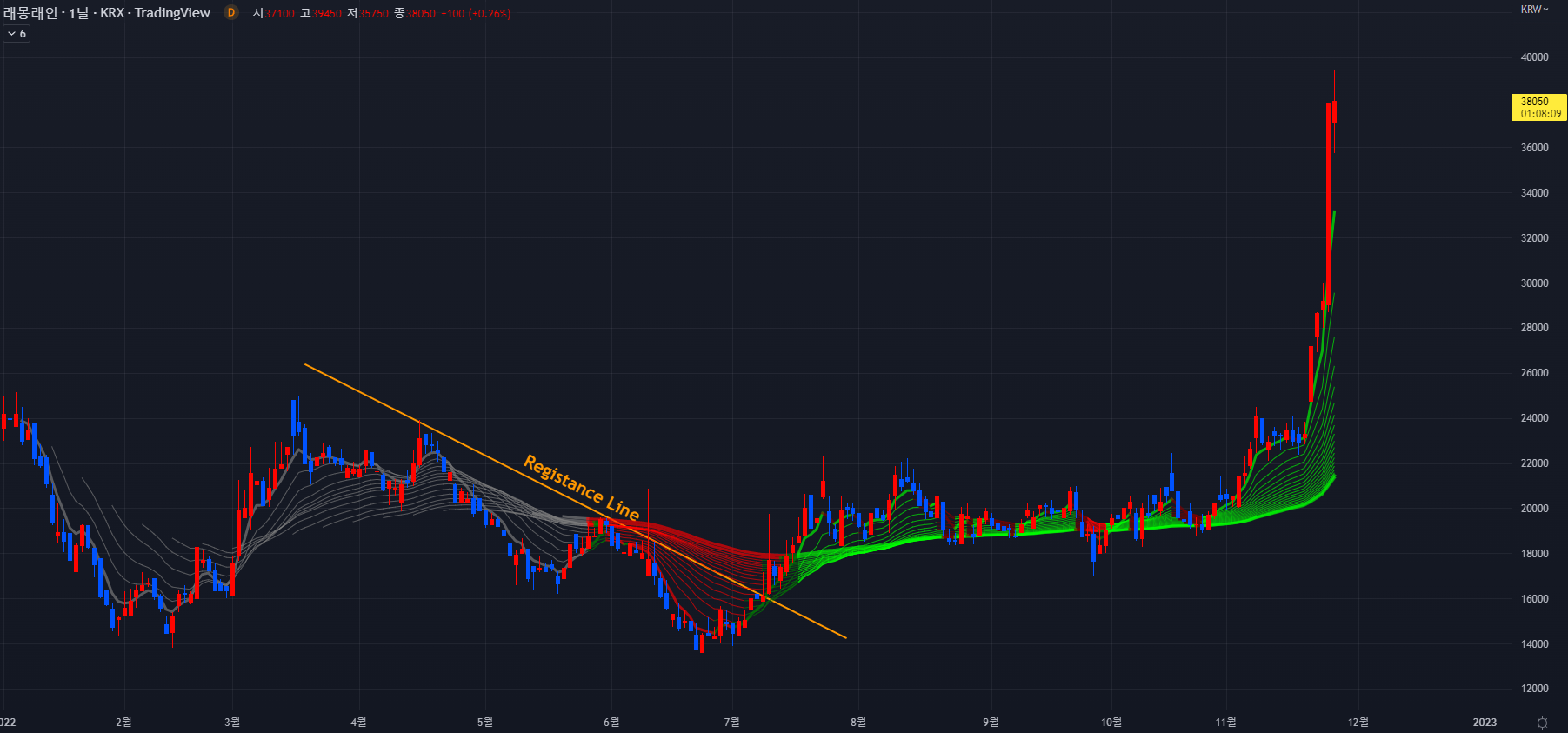 상장한지 11개월 밖에 되지 않은 종목이라 지금의 상승은 해당 종목의 신고가를 계속해서 갱신하는 중입니다.