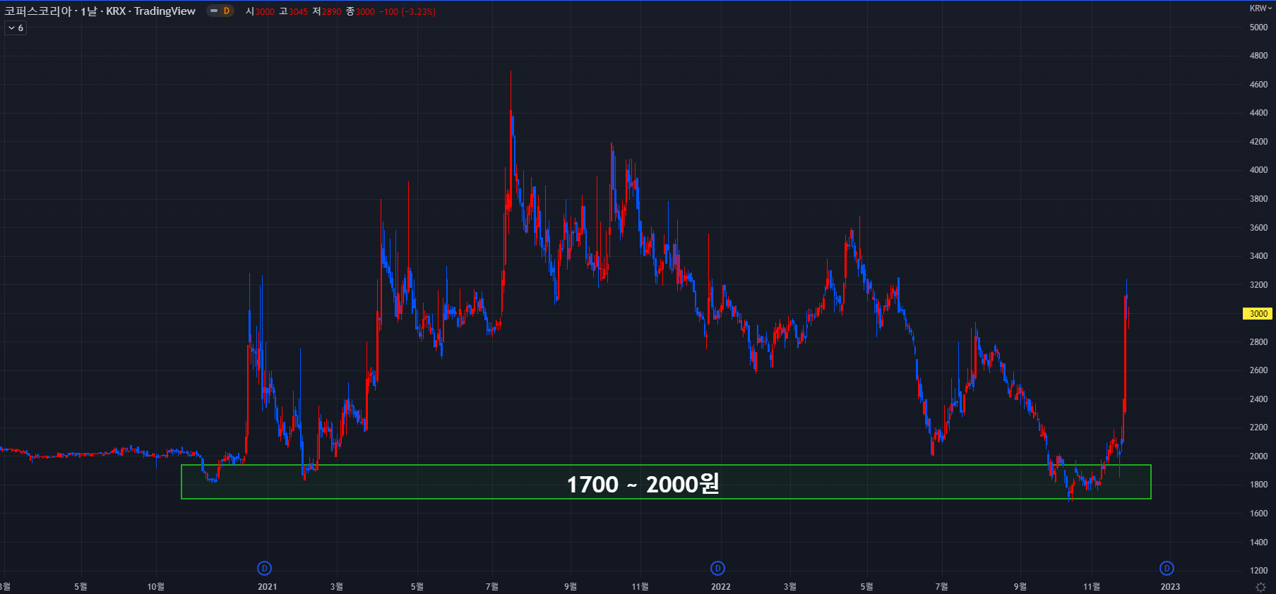 전체 주가 흐름에서 1700 ~ 2000원 구간에서는 어김 없이 강한 매수세가 등장한 것을 알 수 있습니다. 해당 가격은 어떻게든 지키고자 하는 마지노선이라는 느낌이 강하며 기술적 분석으로는 강한 지지 레벨이 형성되었다고 말할 수 있습니다.