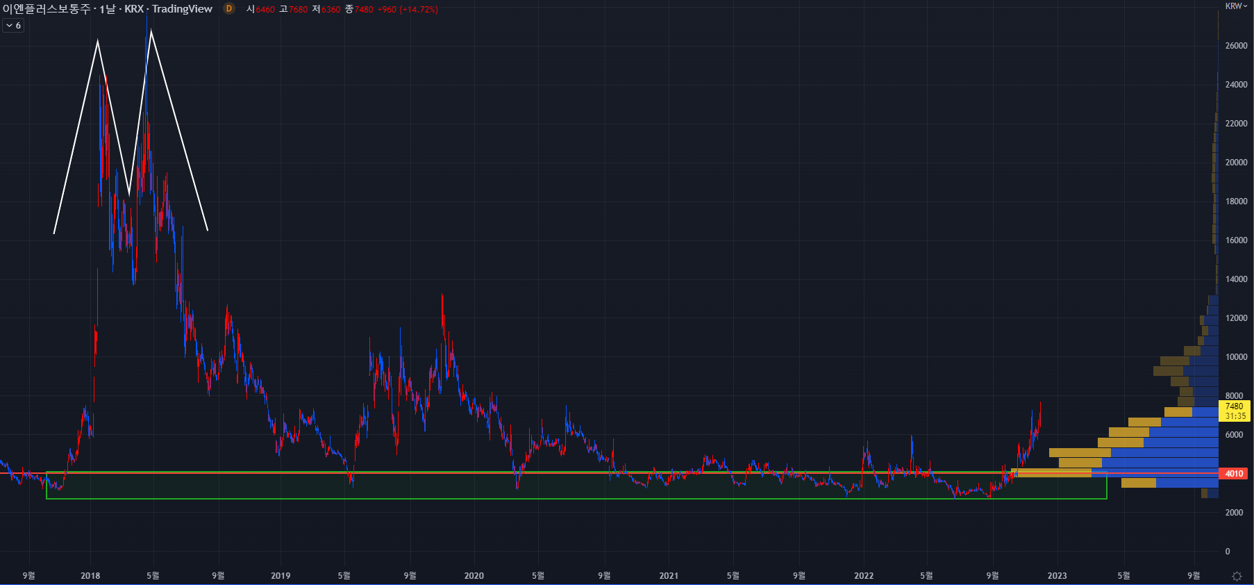 두번째 특징은 2700 ~ 4000원 영역에서는 높은 거래량이 발생하고 매수세가 등장하며 지지 레벨이 된다는 것입니다. 해당 영역 범위만 하더라도 50% 변동폭을 가지기에 절대 작은 폭이 아니지만 과거 5년의 흐름에서 해당 가격대는 주가 흐름에 큰 영향을 주며 이례적인 거래량이 반복해서 등장하는 자리였습니다. 즉, 주가 방어를 시작하는 가격대 이므로 해당 위치는 이엔플러스 종목에서 계속해서 중요한 가격이 될 것입니다.