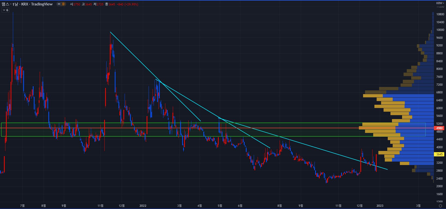 매물대지표를 통해 확인했을 때 4500 ~ 5200원에서 높은 매물대가 쌓여 있습니다. 이번 상승에서 해당 매물대를 돌파할 수 있다면 다음 저항 매물대 6500원까지는 저항이 약할 것으로 보입니다.