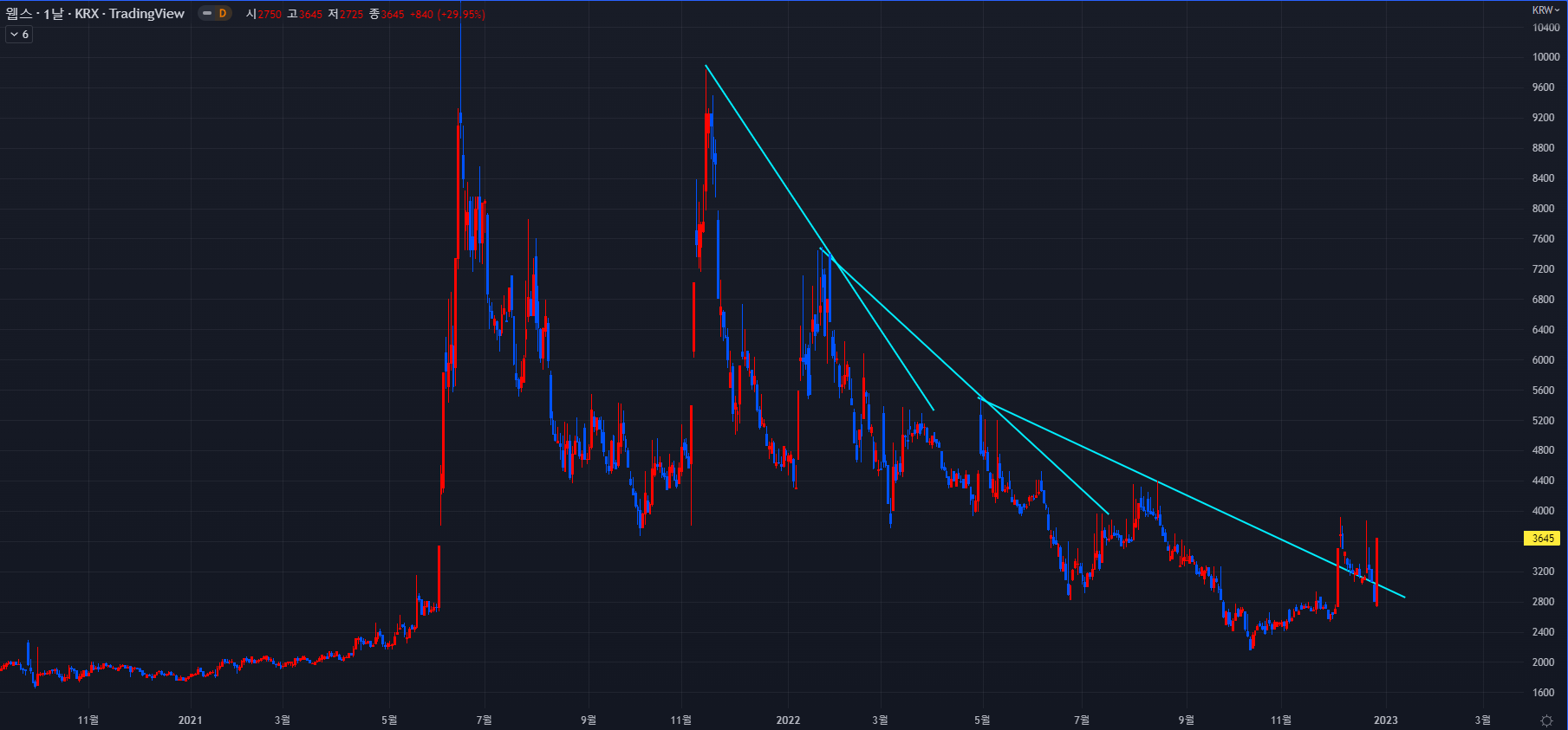 차트를 통해 가격 흐름을 살펴보겠습니다. 2021년 400%이상의 큰 상승을 보여주며 10900원 최고가를 기록한 뒤 하락하게됩니다. 상승의 기간이 길진 않았지만 짧은 기간에 크게 상승한 것이 특징이며 조정 후에 높은 거래량과 아래꼬리가 긴 상한가를 기록하며 갭상승 + 상한가로 다시금 이례적인 상승을 보여주었습니다. 하지만 신고가 갱신에는 실패하며 1년간 하락하게 되었습니다.