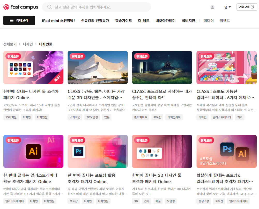 워낙에 많은 온라인 강의 판매사이트가 있어서 나름대로 커리큘럼도 보고 샘플강의도 들어보고 신중하게 선택을 했는데, 패스트캠퍼스로 선택한 이유는 다른곳과는 달리 '패키지'상품으로 포토샵+일러스트 강의 이런식으로 세분화되어 있는 것이 아닌 '디자인툴' 올일원 패키지가 있는 점이 맘에들었습니다.